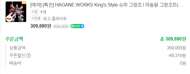 킹스 스타일 슈퍼 그랑죠. 프라모델도 아니고 비싼 합금 피규어로 나온다는데 이걸 살까 말까 고민을 했는데, 막상 발표되고 나서 보니 생각보다 저렴(?) 한데다 월간 쿠폰도 마감 직전이라서… 구매했다.