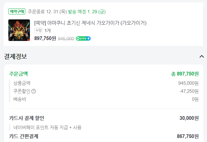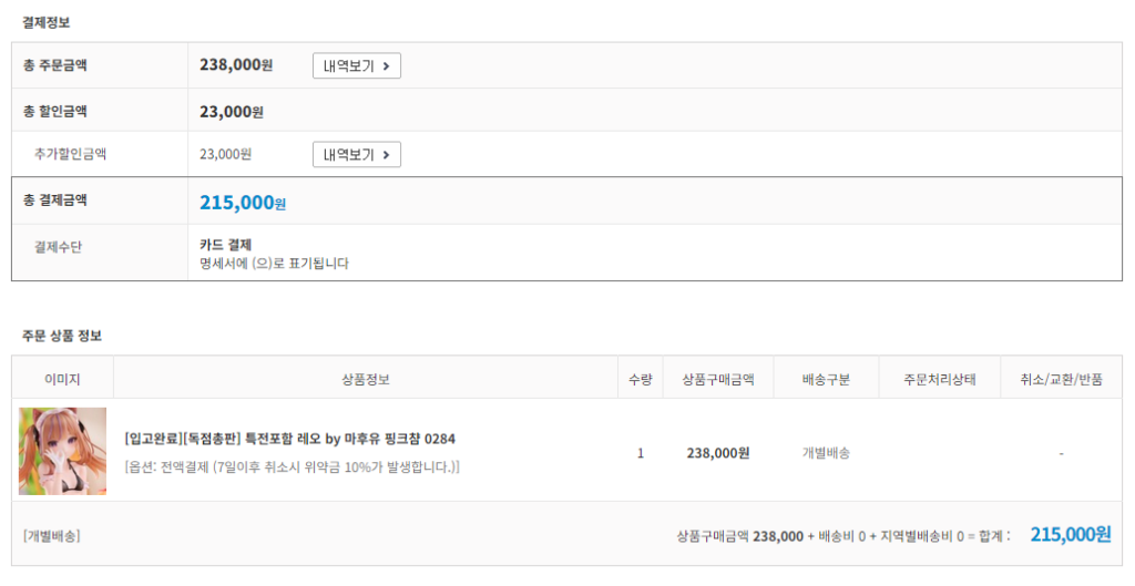 오리지널 피규어. 찜목록에 넣어두긴 했지만 결국 구매 허들을 못넘어서 냅두고 있던 제품이었는데, 우연히 이게 일본 현지에선 프리미엄 붙었다는 소식을 들었다. 그래? 국내샵도 뭔가 할인 붙어있긴 한데 할인 해서 정가인지 진짜 할인인지는 모르겠네. 그래도 뭐 그렇게 해서 20만 초반대면… 구매해도 되겠다, 싶어서 질렀다.