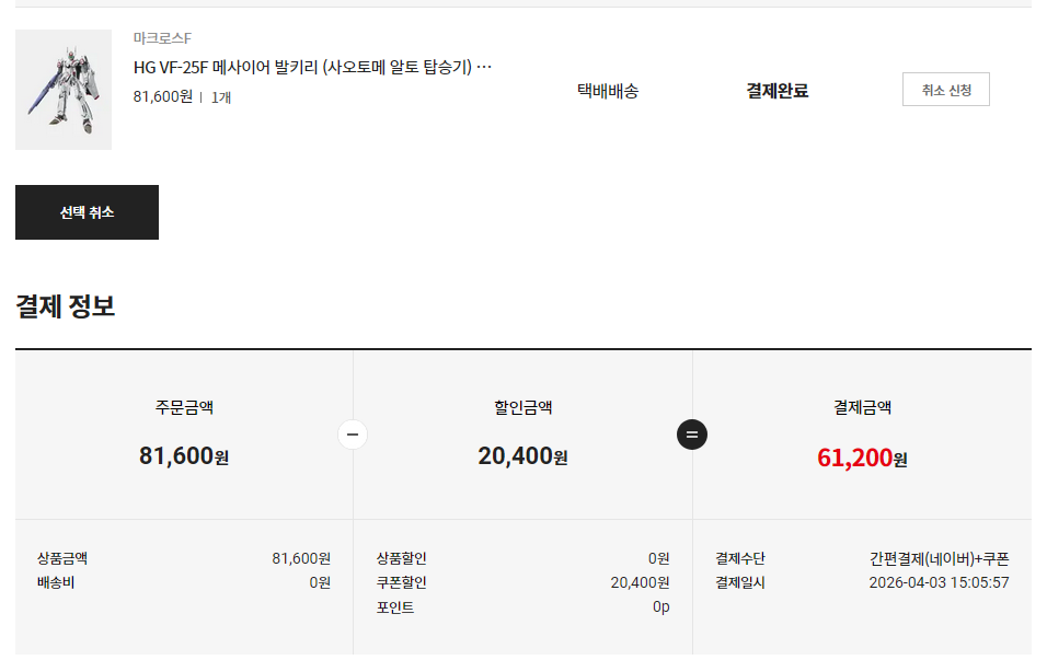 26/04/03 지름목록작성일자 2026-04-05 05:162026-04-05 05:16 글쓴이 Alkaid HG VF-25 알토기. 매번 하듯이 네반몰에서 일단 건지고 반몰 대기열 기다리는 식으로 했는데 이번엔 구매 성공했다. 그래서 DX판에 쿠폰까지. 딱 프라모델 정가에 아크스타 공짜라는 느낌의 지출이 되는군. 사실 그리 필요 있는 굿즈는 아니지만…