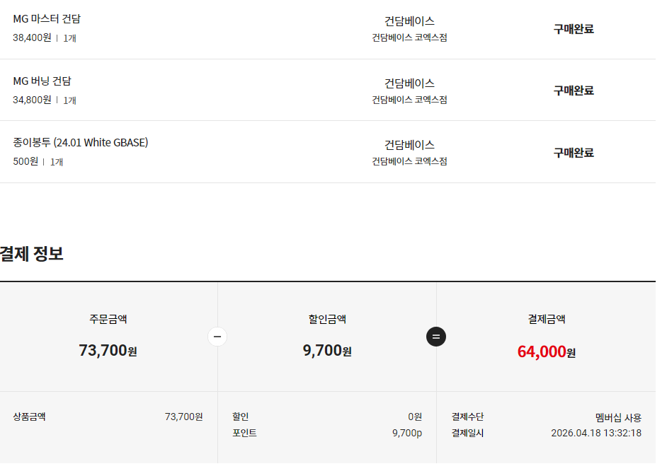 외출 한 김에 코엑스 건베 구경을 하는데… MG 버닝 건담들 사이에서 MG 갓 건담을 발견했다. 응? 이게 아직 남아 있다고? 희귀품 확정인데 지를까? 근데 이제와서 이거 하나만 달랑 사 봤자… 라고 좀 고민하다가, 바로 옆에 있던 MG 마스터 건담도 같이 집어들었다. RG 마스터 건담이 근 시일내에 나오진 않겠지 그래!